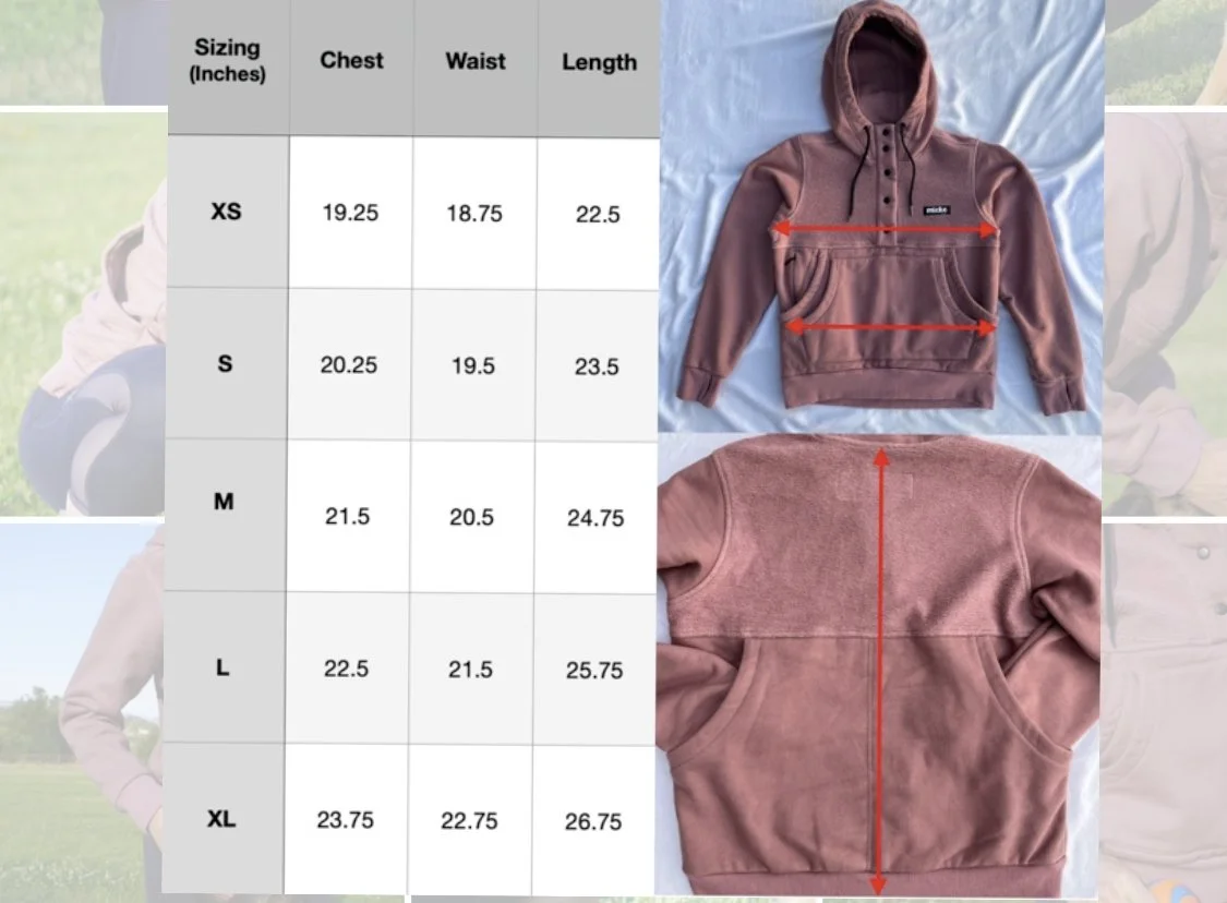 The classic, iconic hoodie engineered with the functionality of classic outdoor gear. Tuff, heavy weight organic cotton. A shorter length cut so it rests above the hips. 6 oversized pockets including 4 deep ‘Quadrant Pockets’ - one on every side, a classic marsupial pouch with added depth, and a deep hidden zipper pocket for safe storage. 1/2 of the front has snap openings so its easy to get over your head and wear open or closed. Thumb holes in the cuffs for extra warmth, and a deep hood with draw strings for an extra option for neck coverage. This garment is traditional woman’s sizing. Our goal is to avoid returns due to sizing discrepancies, and we’re very happy to help if you have any questions.